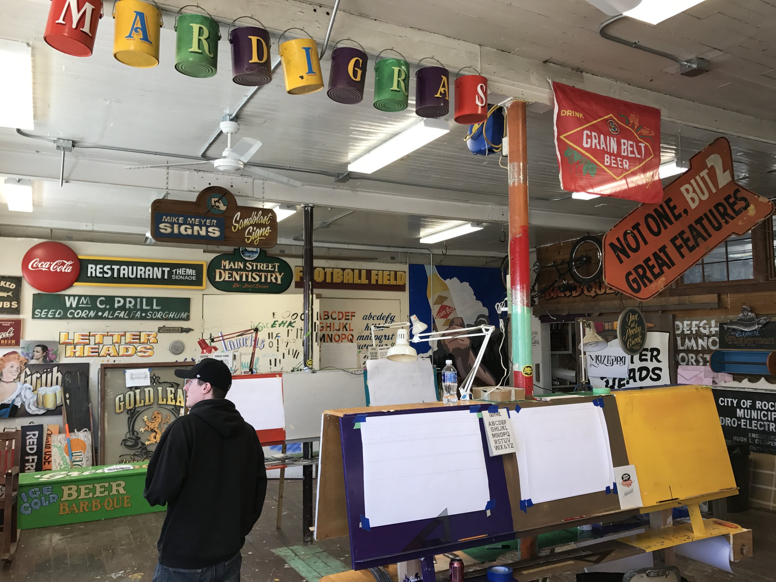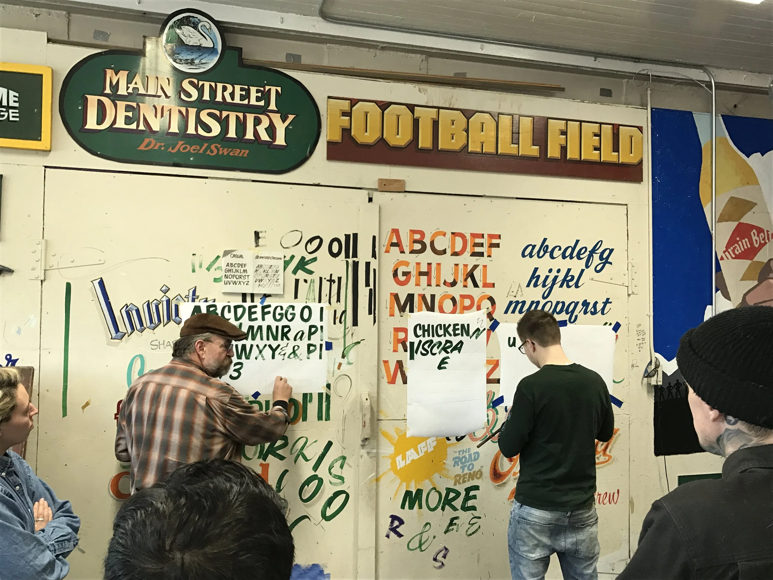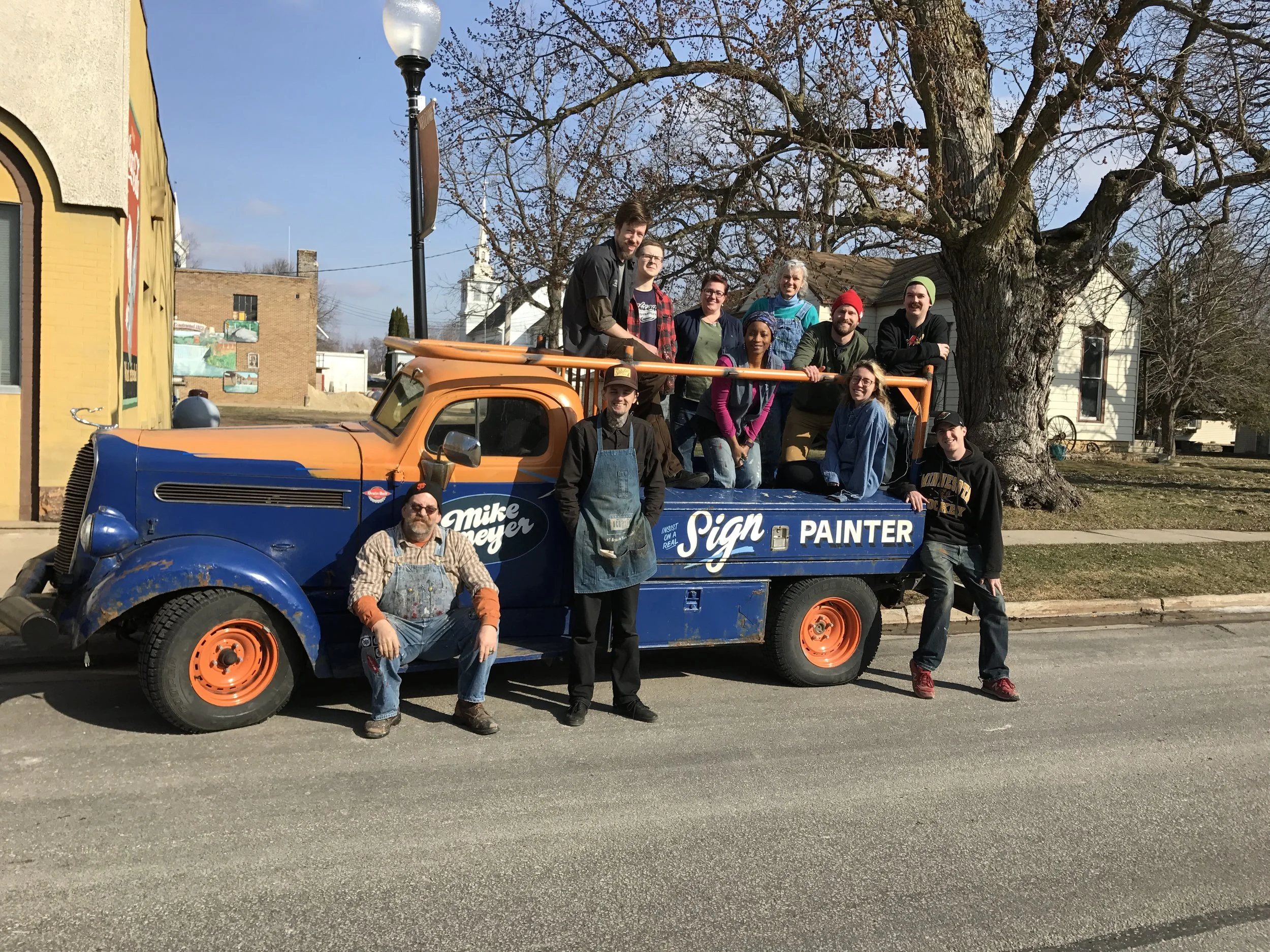 A little over two years ago was the first time we made the trek to Mike Meyer's shop in Mazeppa, Minnesota, and the first time we had hands-on training from a true sign painter. We had been self-taught until then, and the things we learned and people we met really set us off on the right path. Two years later, and with some backing from The Arts Partnership, we were back in the Midwest's sign painting Mecca! We spent 4 days learning new techniques, meeting new people, and soaking up all the knowledge we could. It was amazing to look back at how far we've come in those two years, and once again the wealth of knowledge being shared was incredible! We're so glad to be able to continue this trade and tradition, and to bring some new (old!) knowledge home with us. The community of supportive and talented sign painters out there is energizing to be around, and to be able to watch veteran letterers exercise their trade is truly humbling. Here's some pictures from the workshop!